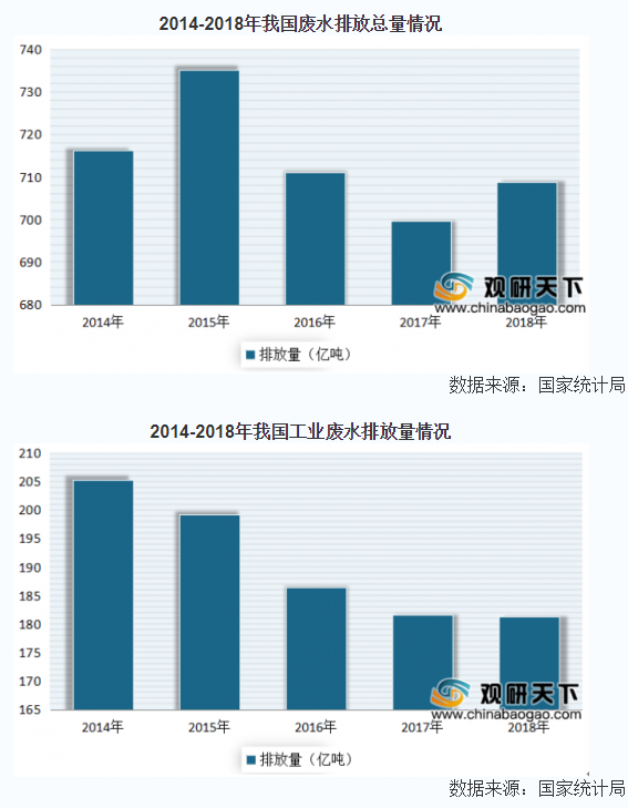 廢水排放方面,雖然有下降,但下降幅度不大,仍維持在較高水平。數據顯示,2018年我國廢水排放總量達到了708.8億噸,較上年同期增長1.3%。其中工業廢水排放量為181.3億噸,城鎮生活污水排放量為527.3億噸。醫院用純水設備
