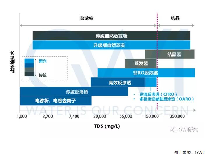 這些技術所使用的系統配置通常包括鹽水預處理技術水處理設備、定制膜過濾系統、新型膜清洗方案、新型排鹽水系統、高壓工況、循環泵、能量回收裝置等。一般來說,反滲透將鹽溶液濃度限制在較高倍數的主要原因是施加的壓力達到滲透壓力的極限,使系統無法進一步濃縮鹽水。針對這一挑戰,目前有兩個頗具前景的新興技術,可將鹽水濃縮至高于高壓反滲透的濃度水平: