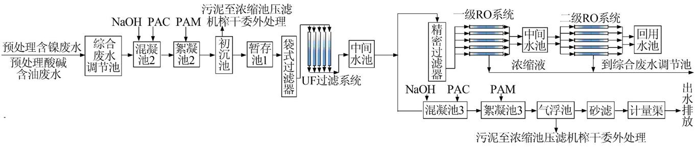 該企業廢水經過處理后,要求廢水排放指標穩定達到國家《污水綜合排放標準》(GB 8978—1996)二級排放標準,即pH6~9COD≤100 mg/LSS≤70 mg/L,石油類≤5 mg/L,色度≤50 mg/L,總鎳達到《電鍍污染物排放標準》(GB 21900—2008)2標準,即總鎳≤0.5 mg/L,實現約70%的出水回用,余下30%的出水接入市政污水管網到集中污水處理廠進行深度處理。純水設備
